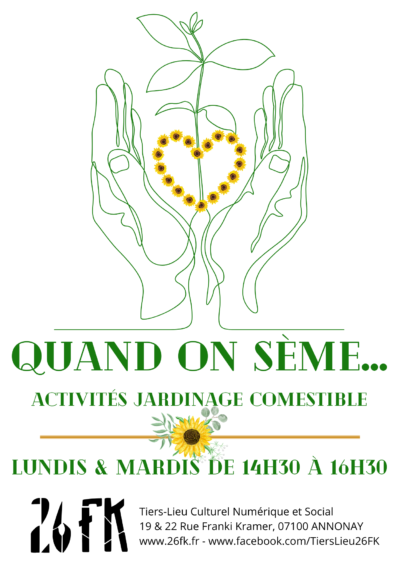 TOUS LES LUNDIS & MARDIS DU MOIS D'AVRIL de 14h30 à 16h30 Avec le soutien de la Mairie d'Annonay, le 26FK s'empare des jardinières du centre historique ! Lié à nos axes d'actions sur la santé et l'alimentation, cet atelier proposé par Tania offre l'opportunité de prendre soin de la terre et de notre lieu de vie quotidien avec l'envie …