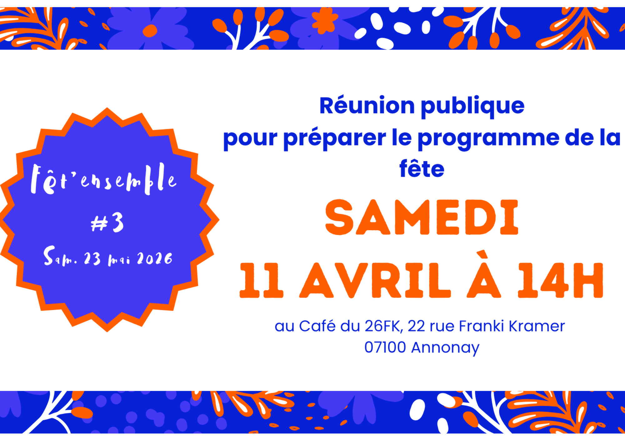 RDV à 14h au café asso du 26FK, pour échanger sur ce qui a déjà été fait, présenter le dessin de l’affiche 2026, et commencer à articuler la programmation de la journée !