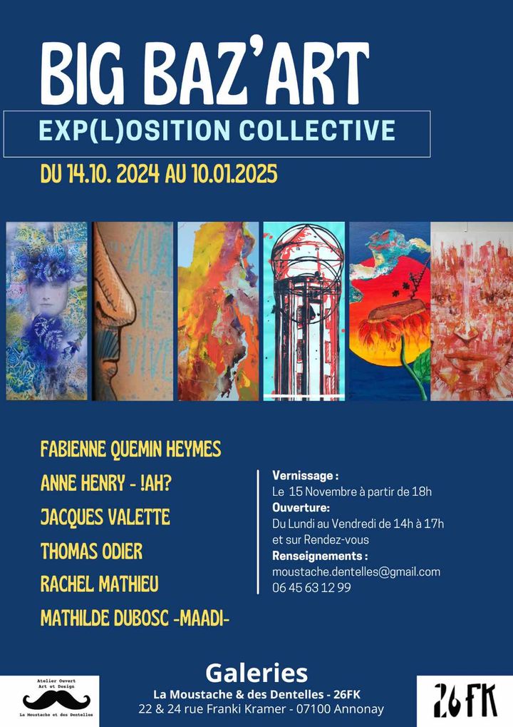 - BIG BAZ’ART – Exp(l)osition Collective6 artistes aux parcours et influences différentes mais toujours autour du travail de la couleur sont réunis pour une exp(lo)sition collective du 14 novembre 2024 au 10 Janvier 2025 à la Galerie Moustache & Dentelles et au 26FK. VERNISSAGE LE 15 NOVEMBRE 2024 à 18h en présence de tous les artistes. L’opportunité de découvrir des artistes locaux aux univers variés …